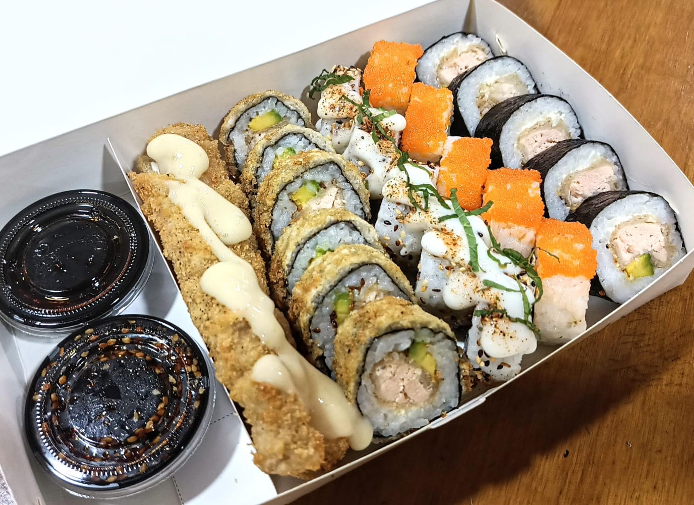 12 SALMON TEMPURA + 10 PHILADELPHIA FUTOMAKI + 2 NIGUIRIS DE SALMON. INCLUYE 1 SALSA TERIYAKI + 1 SALSA DE SOYA + 1 HASHIS (PALITOS).