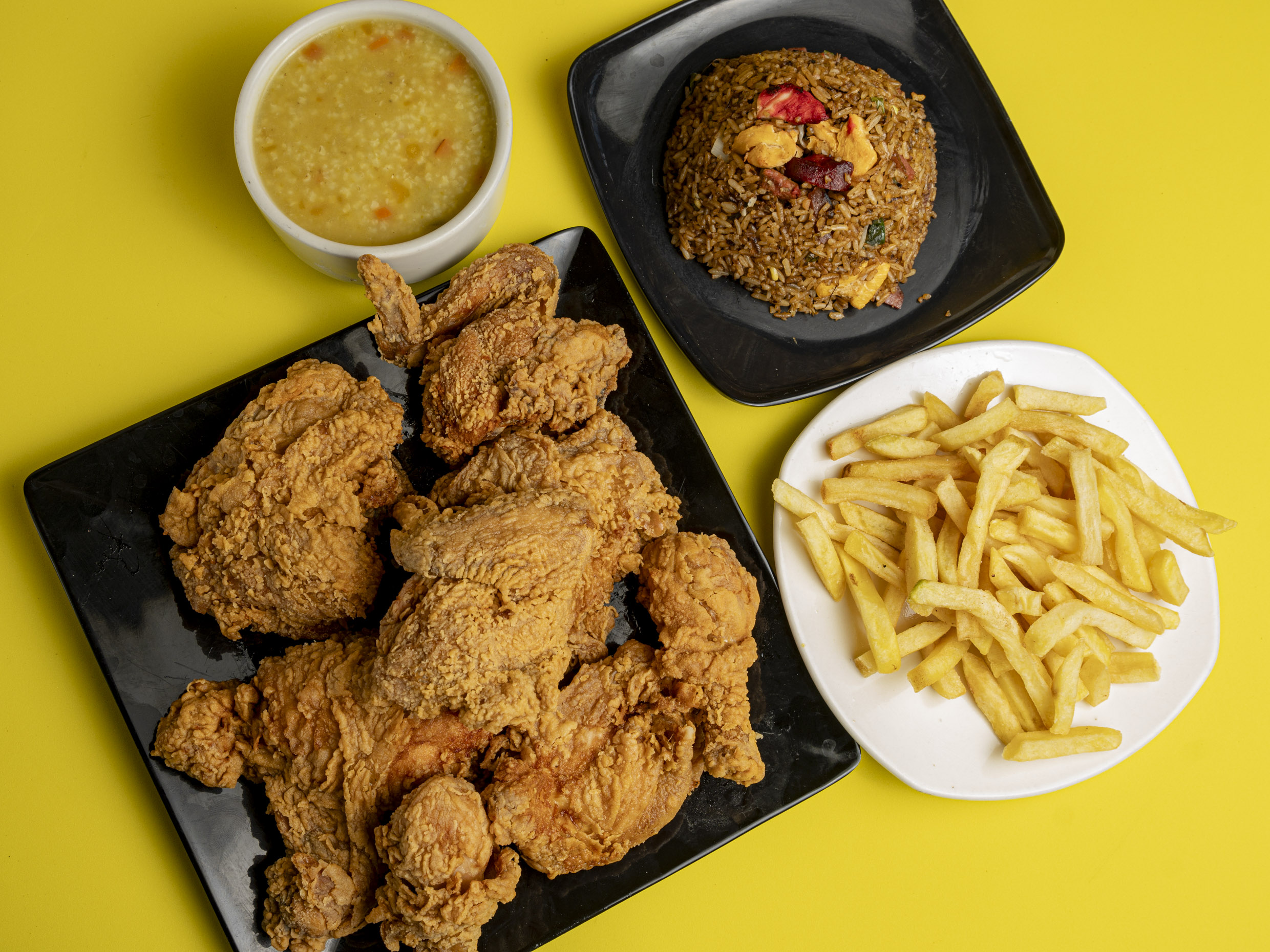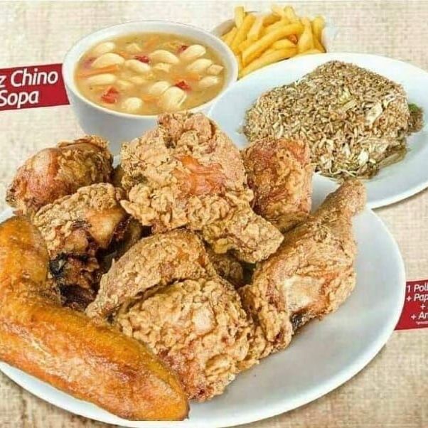 1 Pollo broaster, 1 caja de arroz chino grande, sopa del día, papa a la francesa
