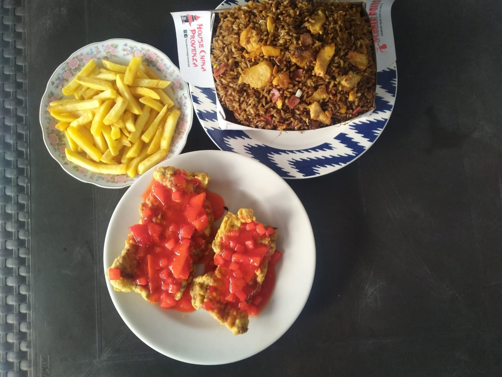 Arroz chino, papa francesa, proteína, opciones: cuarto de pollo, cuarto de broaster, pechuga a la plancha, cerdo BBQ , gratis bebida.