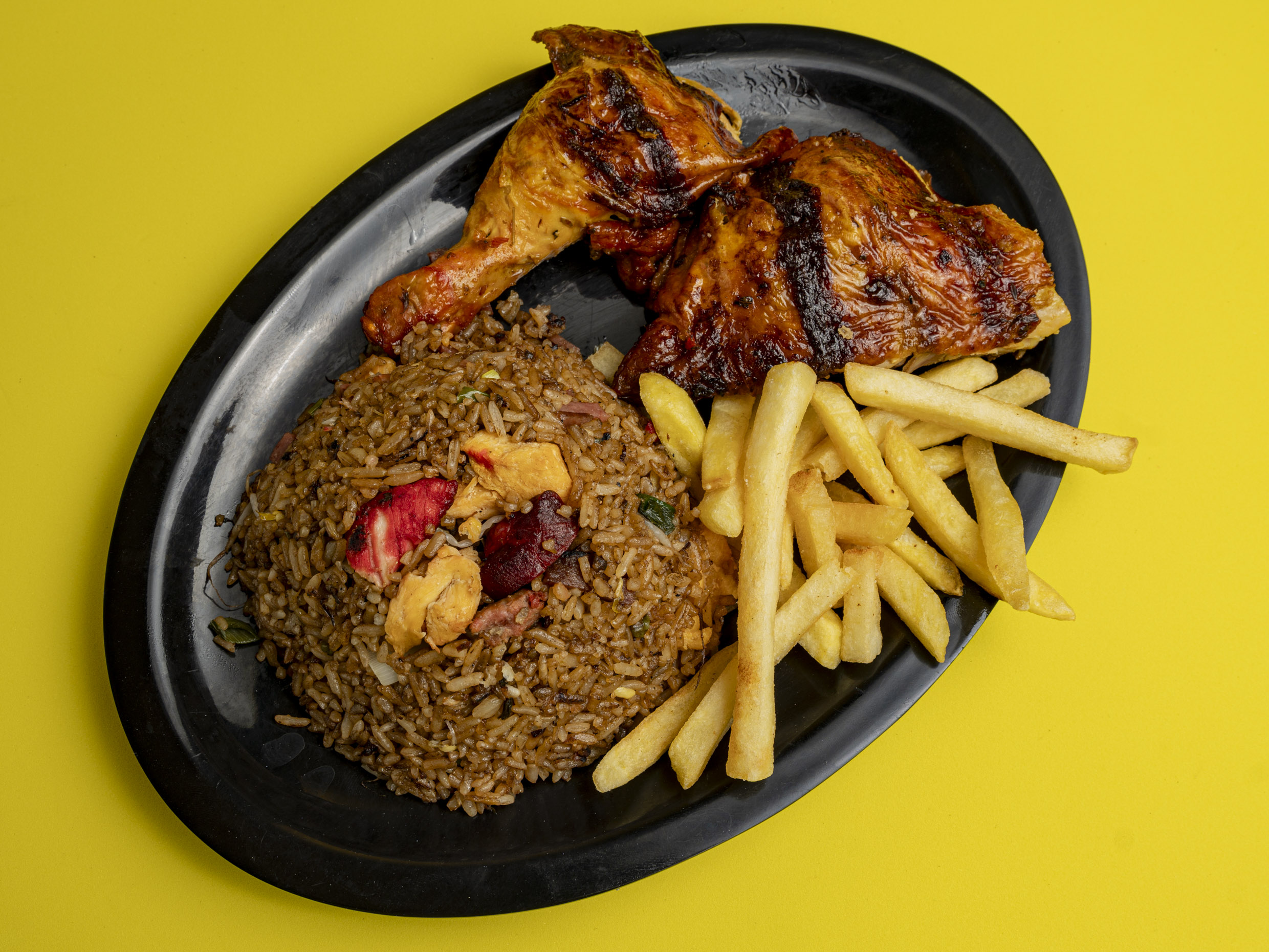 Medio pollo asado, media caja de arroz chino 3 carnes, papa francesa y sopa del día.