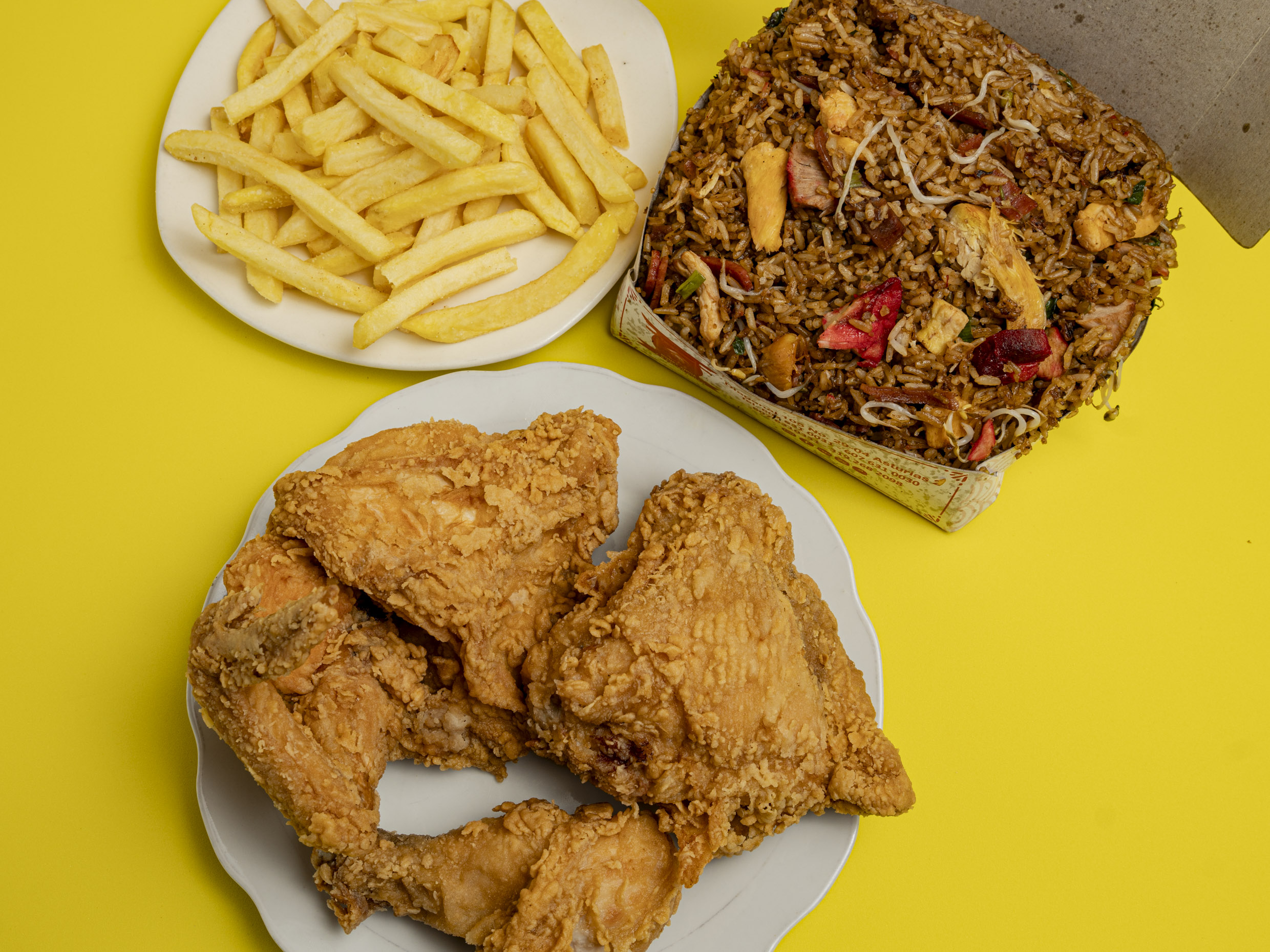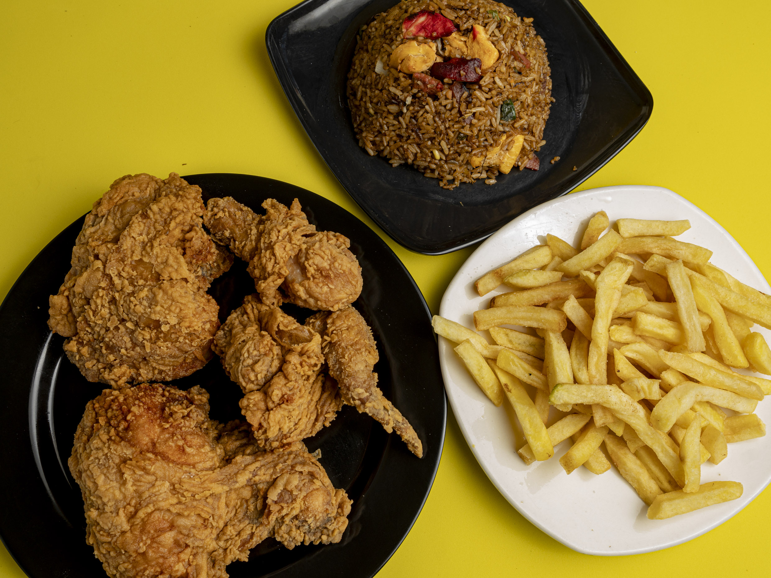 Medio pollo a la broaster, papa a la francesa y gratis porción de arroz chino.