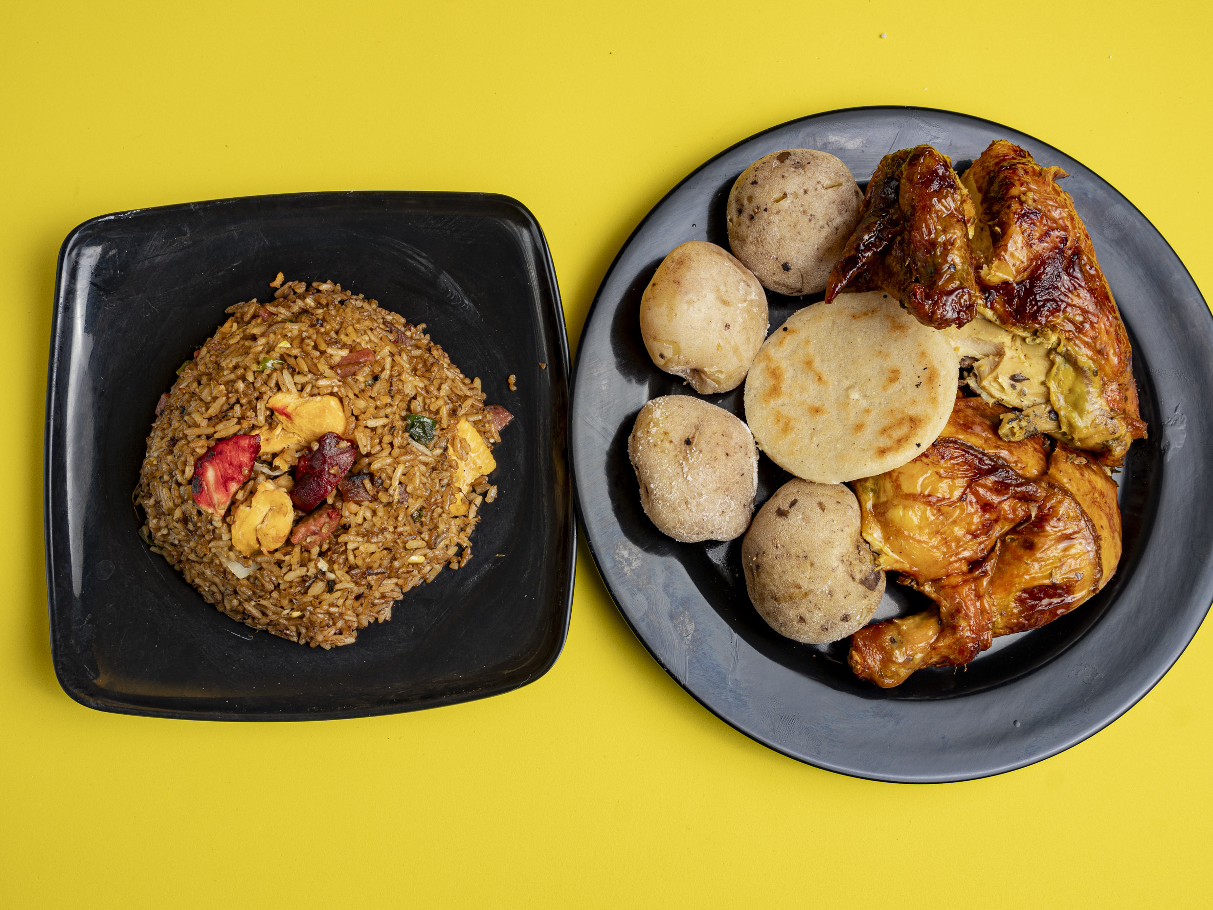 1 pollo asado al carbón, papa al vapor, arepa, sopa del día y 1 porción de arroz chino gratis
