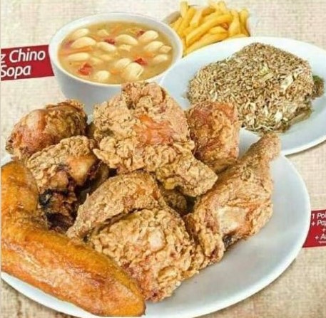 1 pollo broaster completo (8 presas), sopa del día, papa a la francesa, papa al vapor , arepa y porción de arroz chino (gratis)