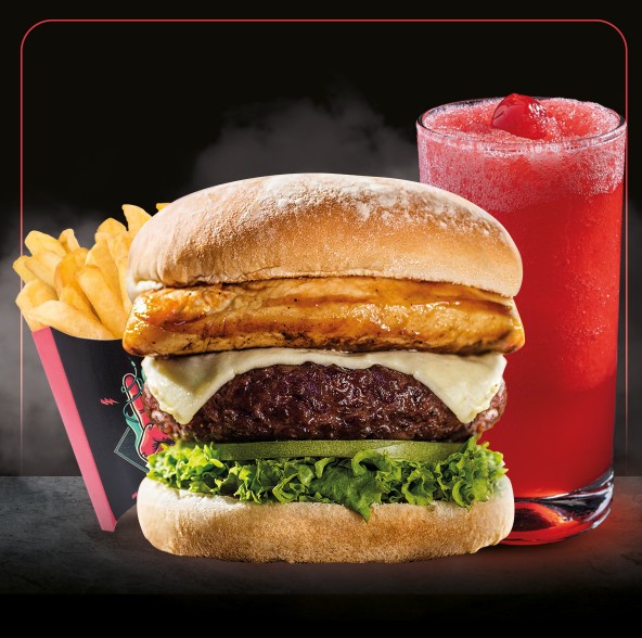 200 g Certified Angus Beef. Carne de res al carbón, carne de cerdo al carbón, queso, tomate, lechuga, acompañada con papas a la francesa.