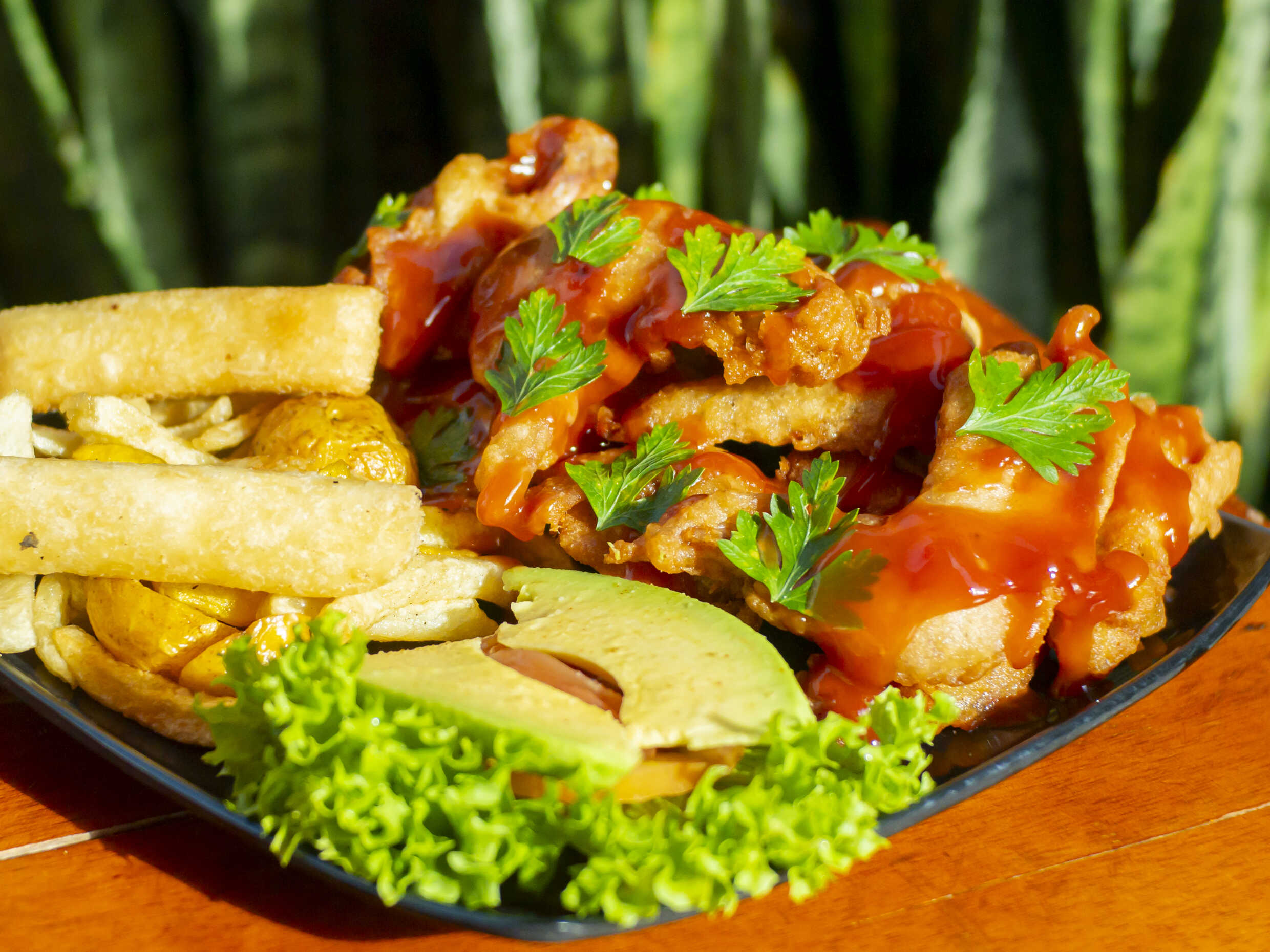 Croquetas de yuca frita, ensalada de aguacate y papas a la francesa.