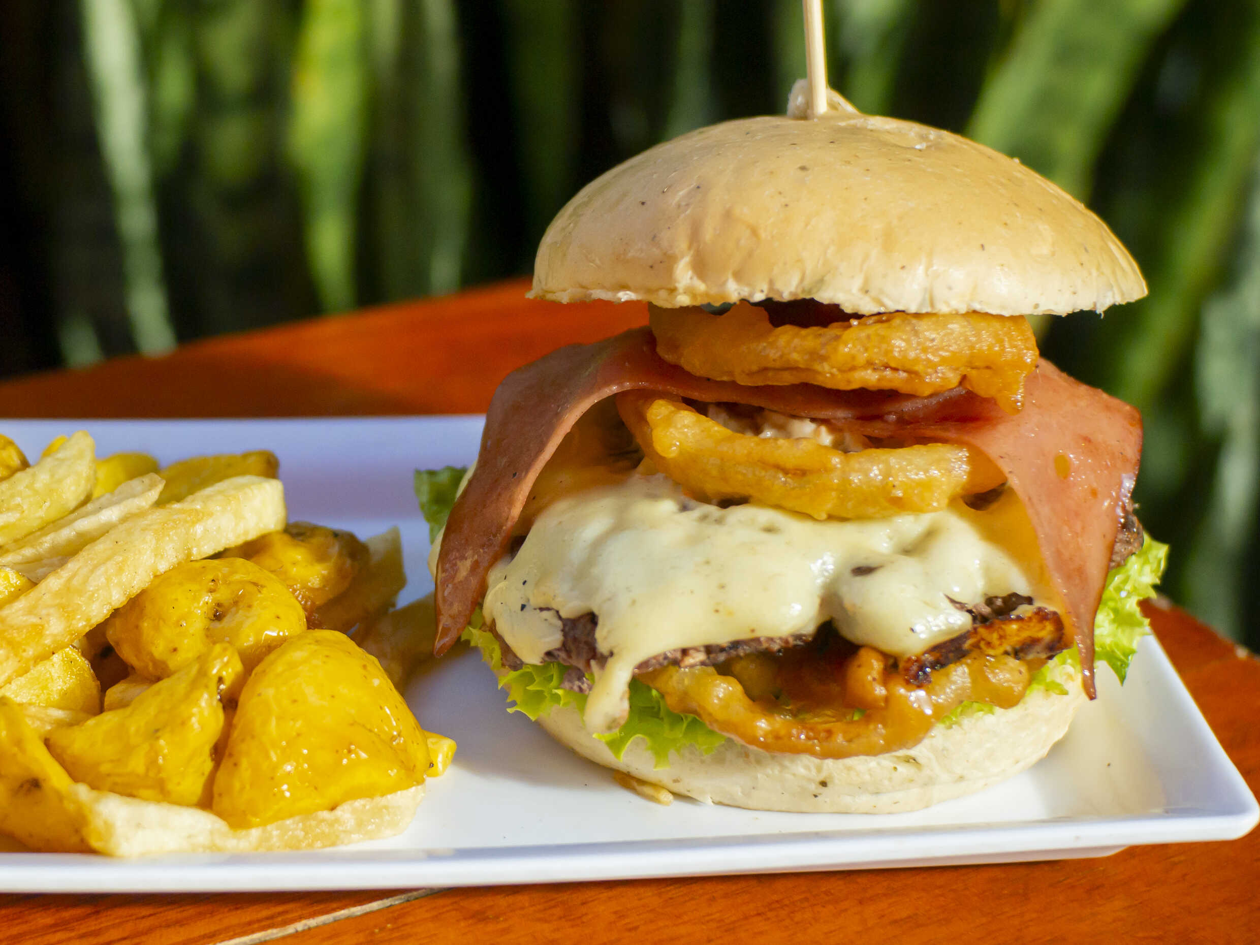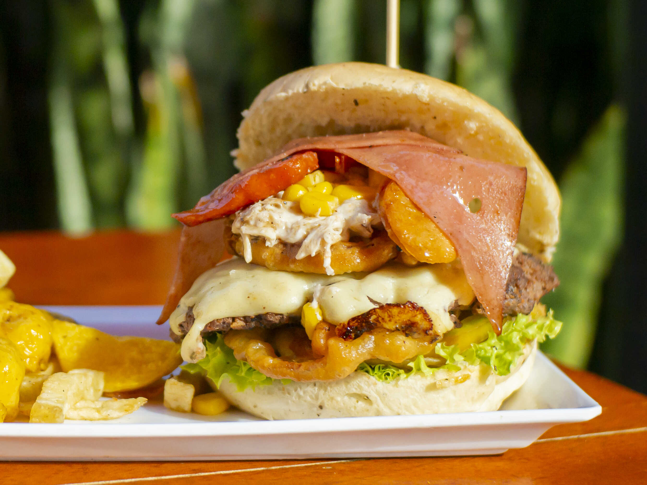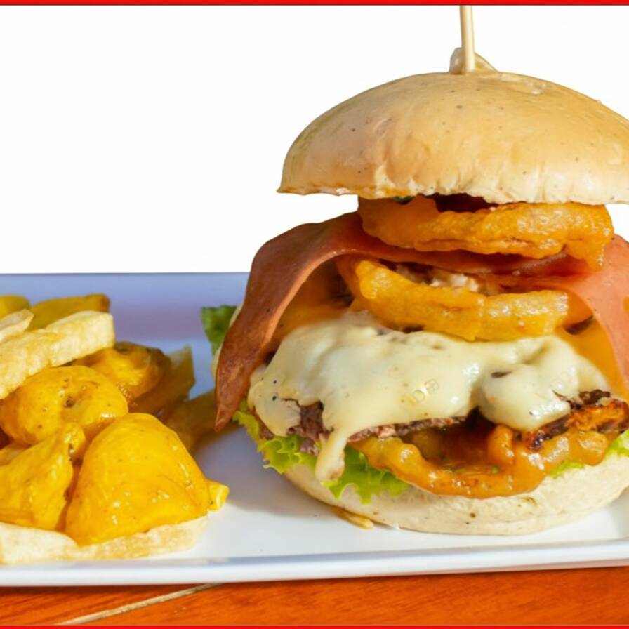 Hamburguesa carne 100 gr, aros de cebolla, pollo, verduras frescas, maiz, chorizo, papas chips, arepa, jamon, queso, salsas acompañadas de papa amarillla y papa francesa 150 gr