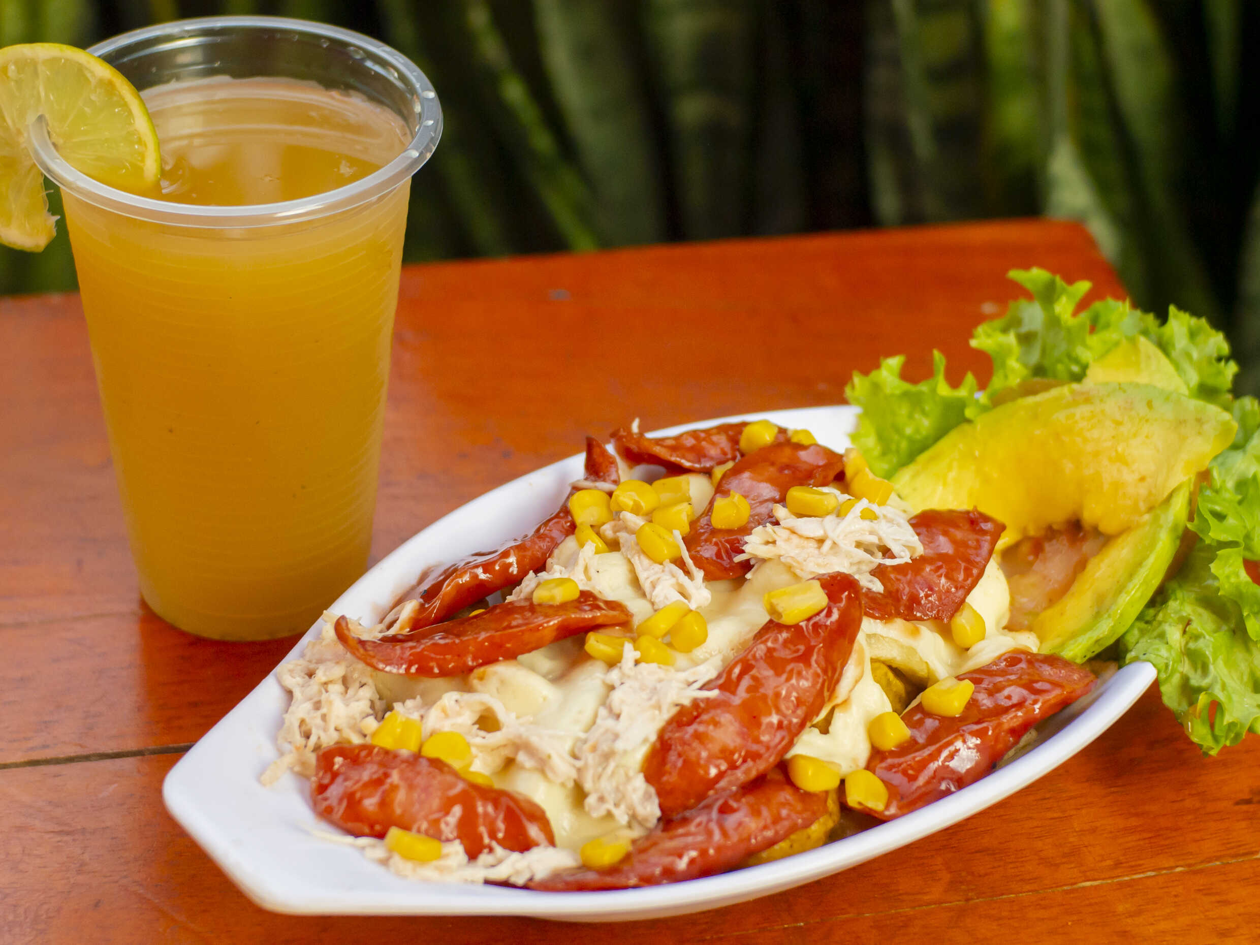 Salchicha americana, papa amarilla, papa francesa, papa chis, maíz, pollo, queso crema, cuadros de piña, queso semi salado, salsas