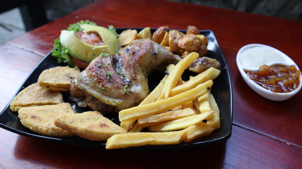 Pierna pernil de 500 g aproximadamente, papas a la francesa o papa amarilla, arepa amarilla, y acompañado de ensalada de aguacate.