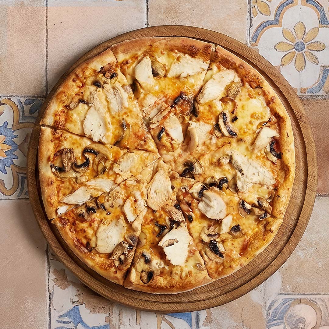 Cortes de pollo con champiñones salteados en finas hierbas, salsa napolitana, queso mozzarella y parmesano.
