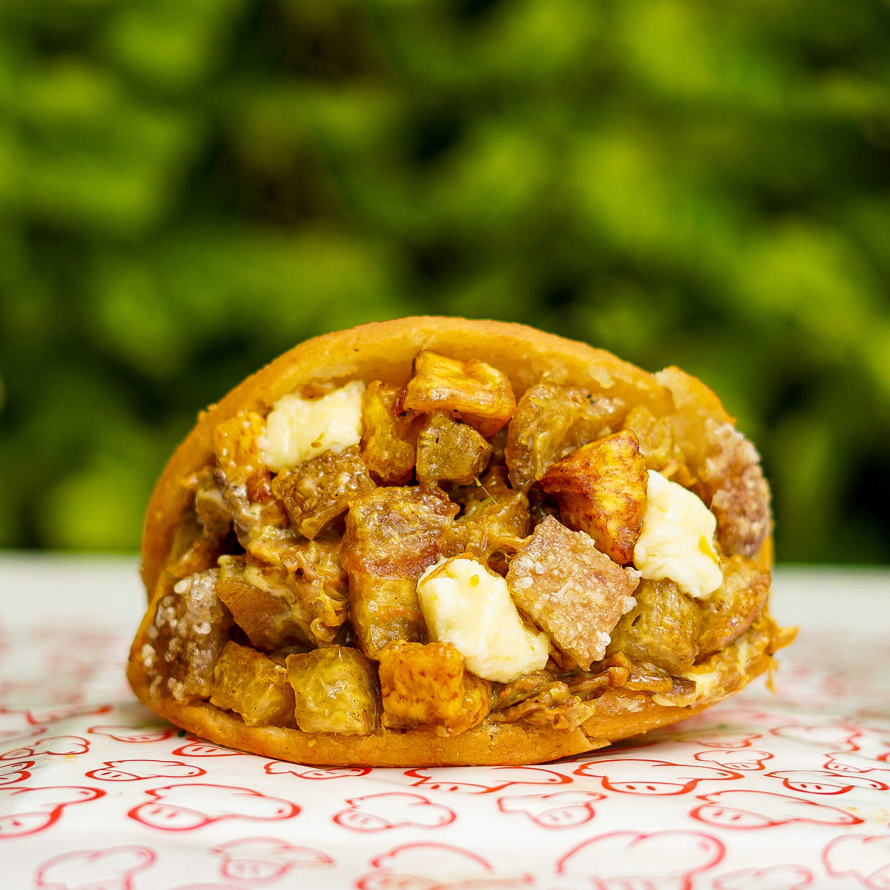 Carne desmechada, chicharrón, maduro frito y queso (200 g).