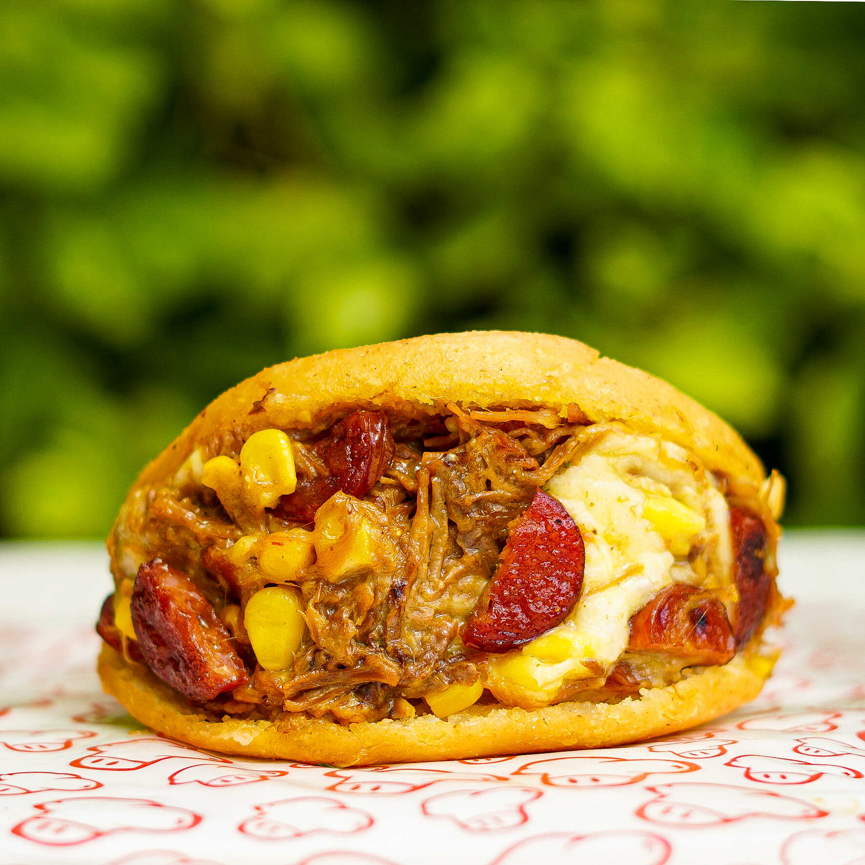 Carne desmechada, chorizo de ternera, maíz tierno, huevo de codorniz y queso (310 g).