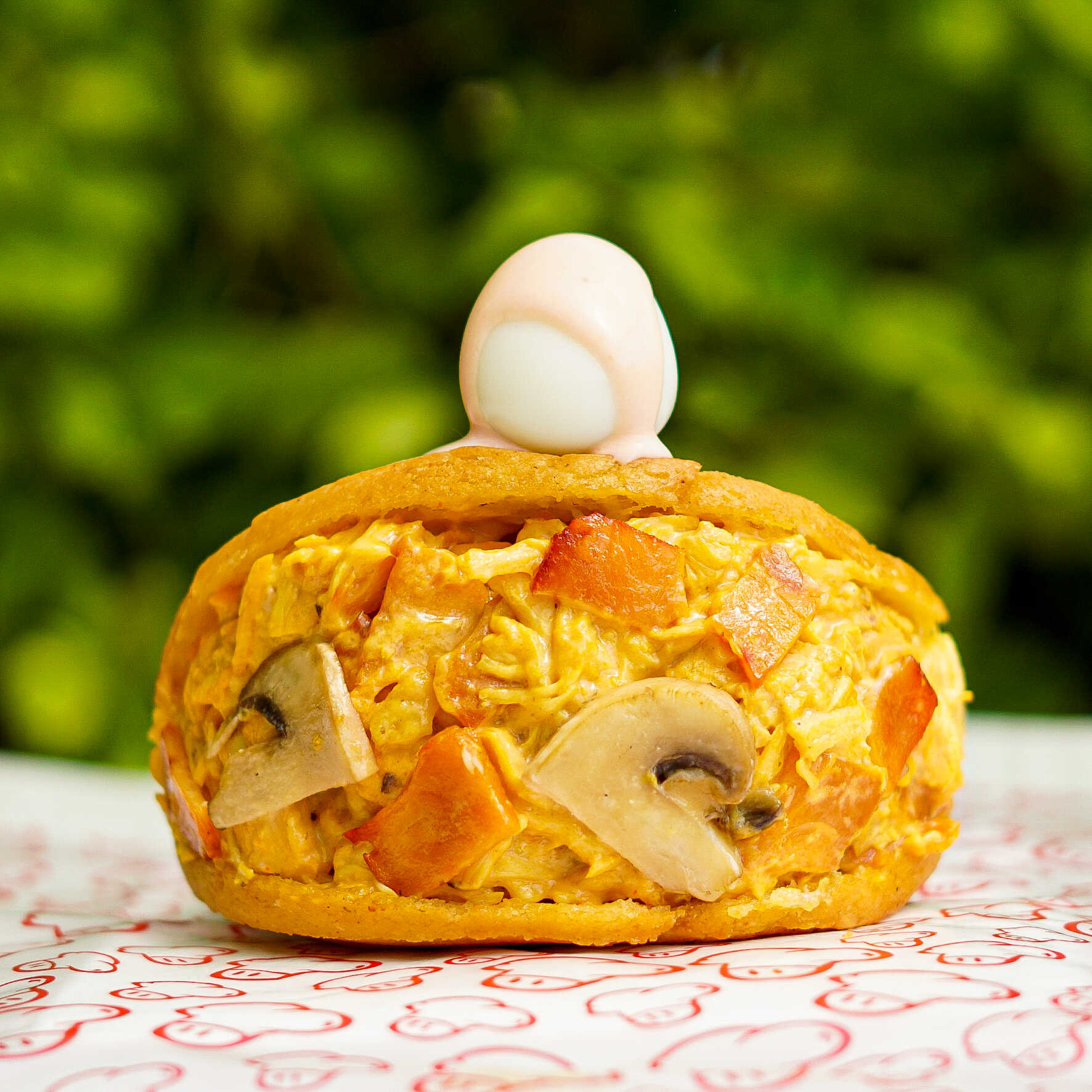 Pollo, champiñón, tocineta, queso y huevo de codorniz (310 g).
