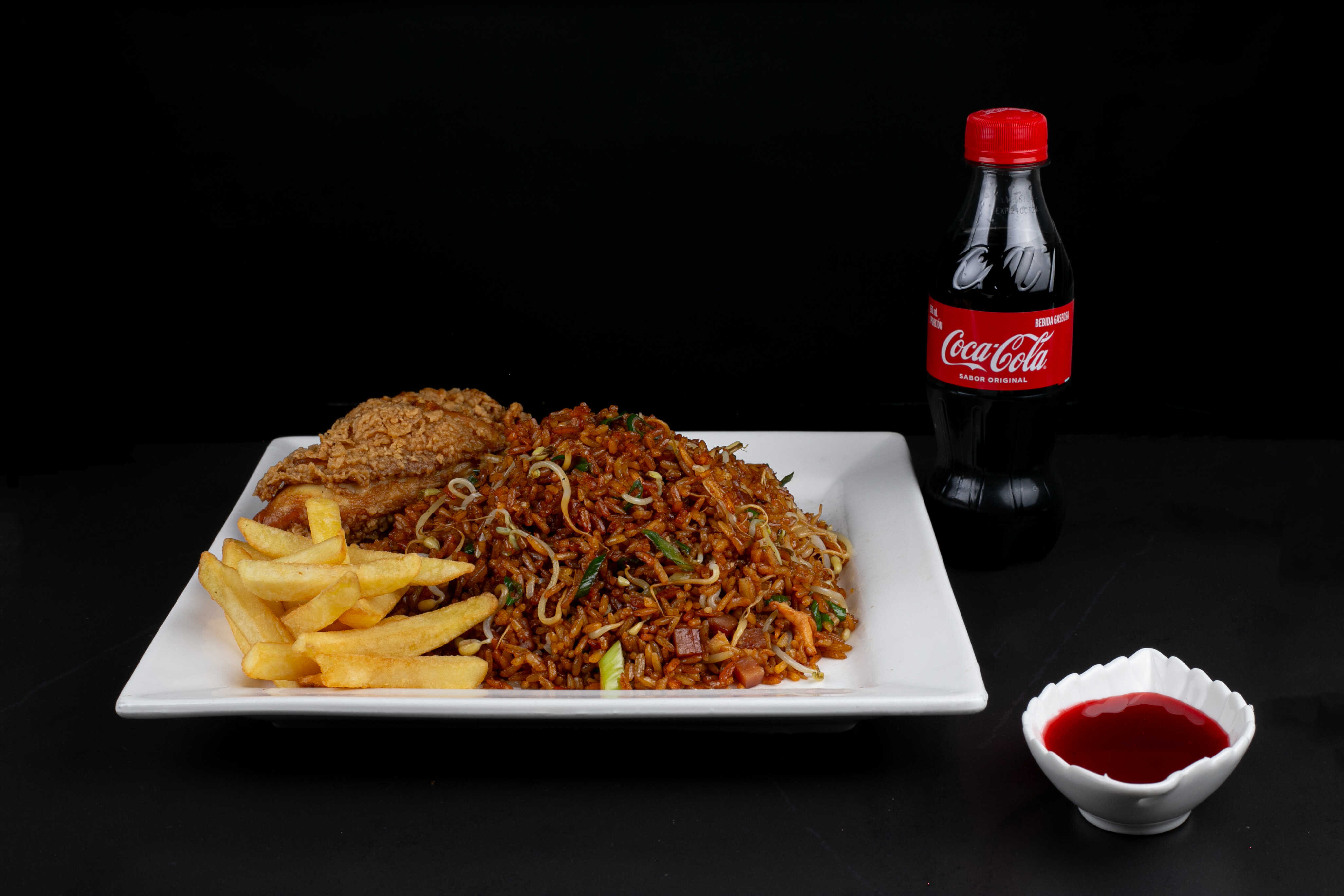 Arroz chino con cebollín, raices chinas, jamón ahumado y ajinomoto) + porción de papas a la francesa + Coca-Cola 1L