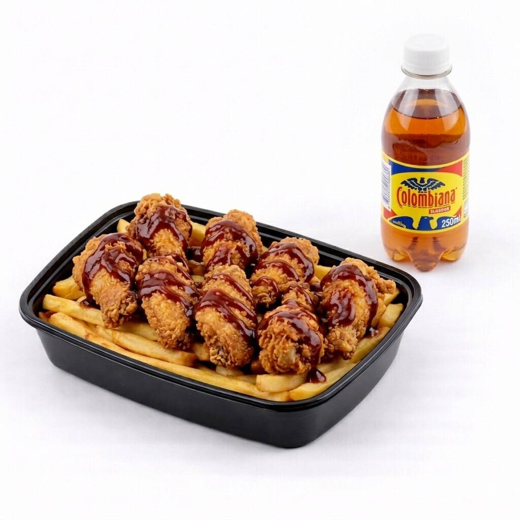 8 Alitas broaster, bañadas en salsa BBQ +papa frita. te obsequiamos 1 bebida postobon 250.