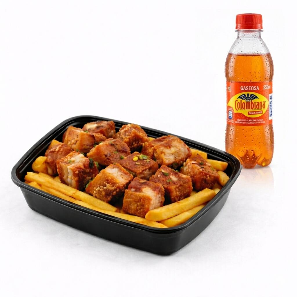 200 Granos de delicioso chicharron carnudo crocante acompañado de papa frita.. te obsequiamos 1 bebida postobon 250.