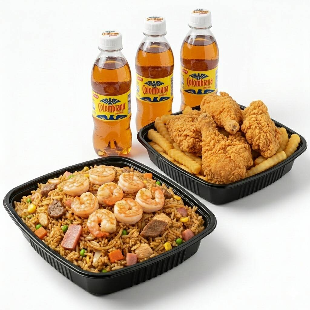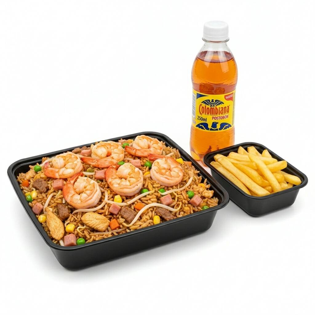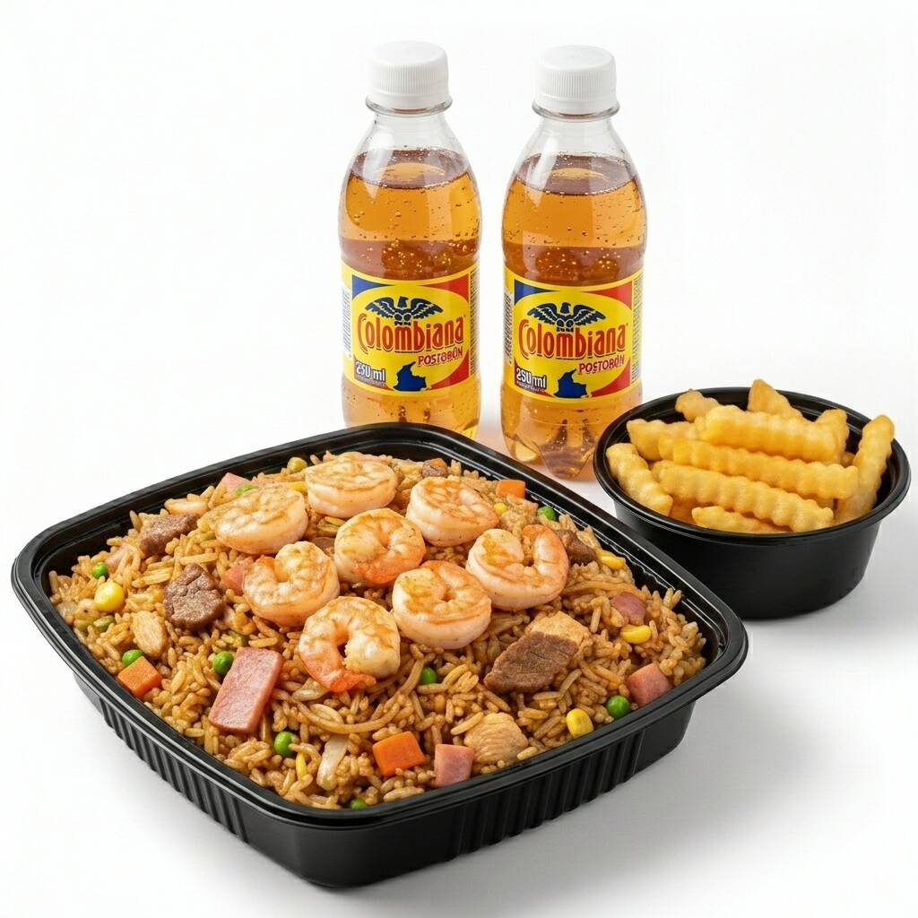 Arroz chinbo de kilo + 6 presas de pollo broaster + papa frita. te obsequiamos 3 bebidas postobon 250.