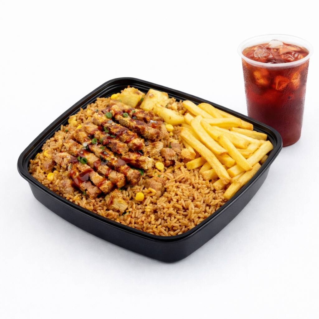 Porcion personal de arroz ranchero 250 gr, pollo, cerdo, maiz, chicharrón crocante picado y yuca cocida en trozos. Acompañado de papa frita. Obsequio té helado. Si no llena, no sale.