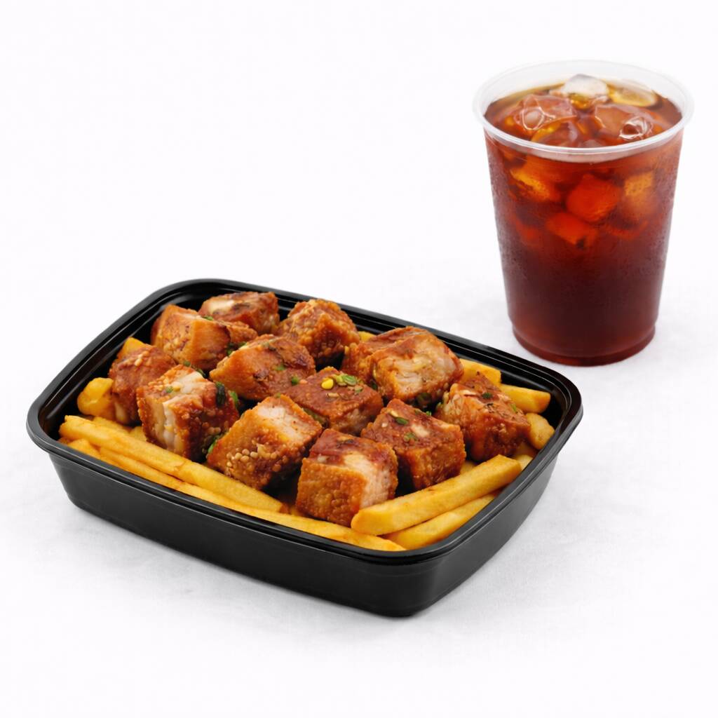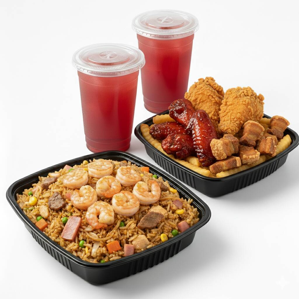 Arroz chino de kilo + 2 presas de pollo broaster + 4 alitas BBQ + Porcion de chicharron carnudo papa frita+ 3 té helado