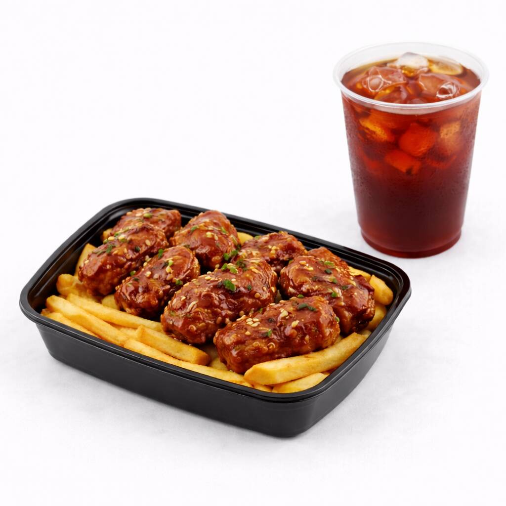 8 Alitas broaster, bañadas en salsa BBQ +papa frita + té helado.
