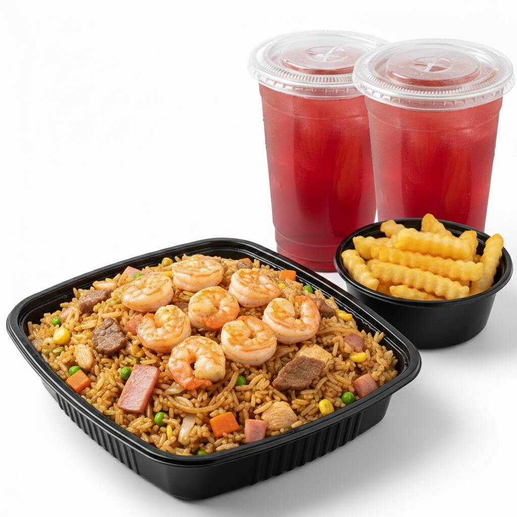 Arroz chino bien cargado 1000 gr, pollo, cerdo, chorizo, carnes, maiz, camarones. . Acompañado de papa frita. 2 Té helados de cortesia Si no llena, no sale.