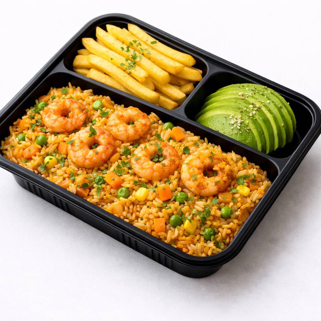 Delicioso arroz de camarones, acompañado de crocante papa francesa, salsas y laminas de aguacate.