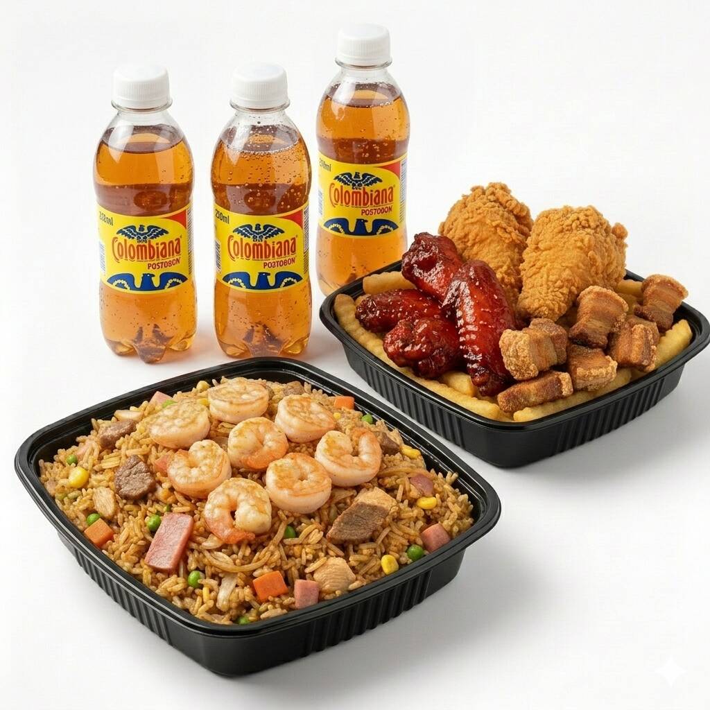 Arroz chino de kilo + 2 presas de pollo broaster + 4 alitas BBQ + Porcion de chicharron carnudo papa frita. te obsequiamos 3 bebidas postobon 250.