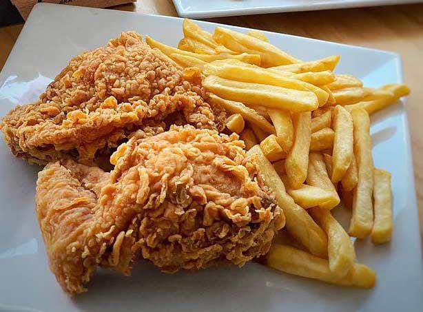 Con una porcion papa a la francesa, plátano maduro, 1 sopa de 16oz y sala tártara con miel