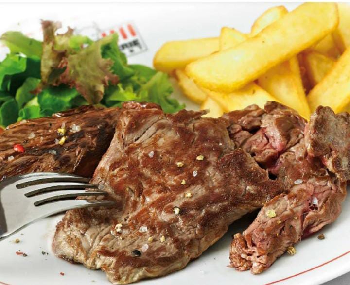Carne asada a la plancha, porción de papas a la francesa, arroz y ensalada.