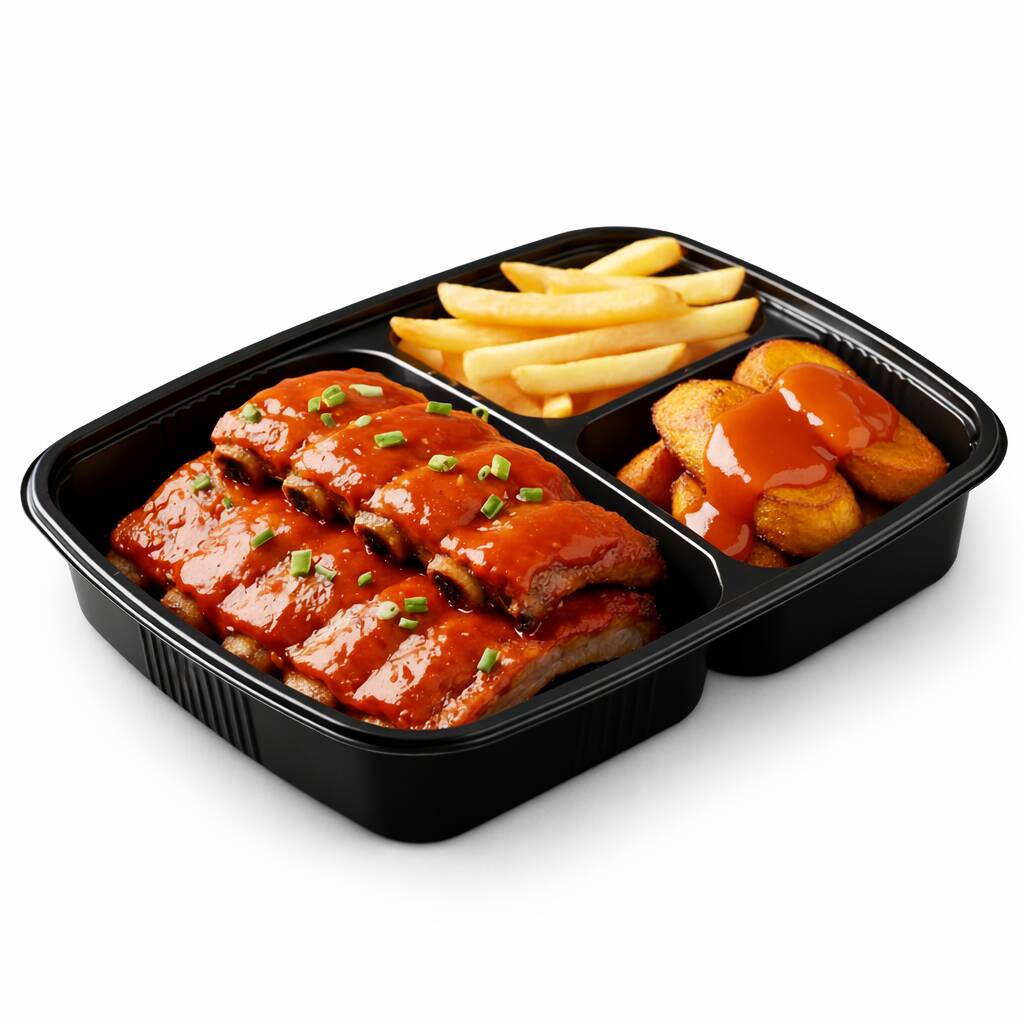 350 gr de costillitas horneadas bañadas en salsa bbq acompañadas papa francesa y vegetales.