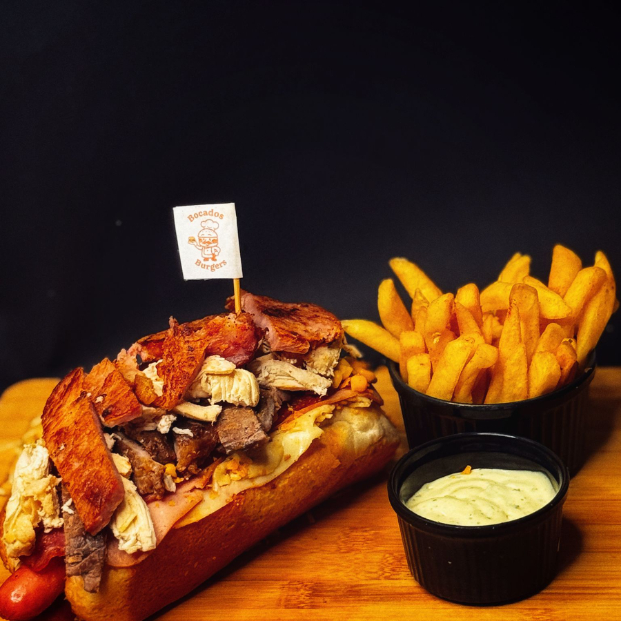 CARNE DE RES, POLLO DESMECHADO , TOCINETA, JAMON AHUMADO, QUESO, TOCINETA, PAPA RIPIO, VEGETALES Y SALSAS