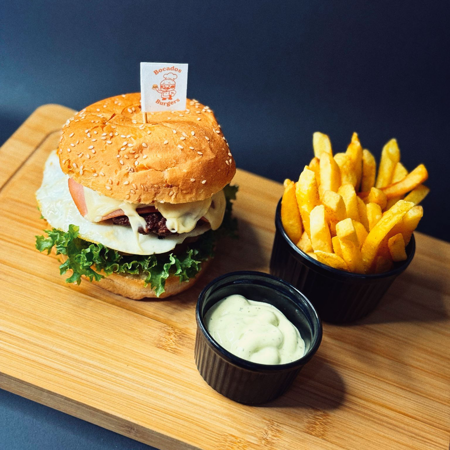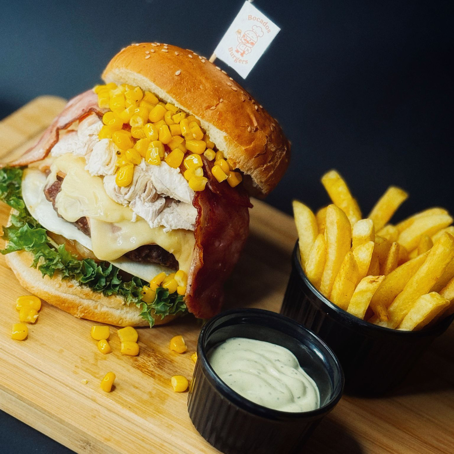 jugosa carne de res, chuleta de cerdo ahumada, jamon ahumado, tocineta, queso,vegetales frescos, papa ripio y salsas