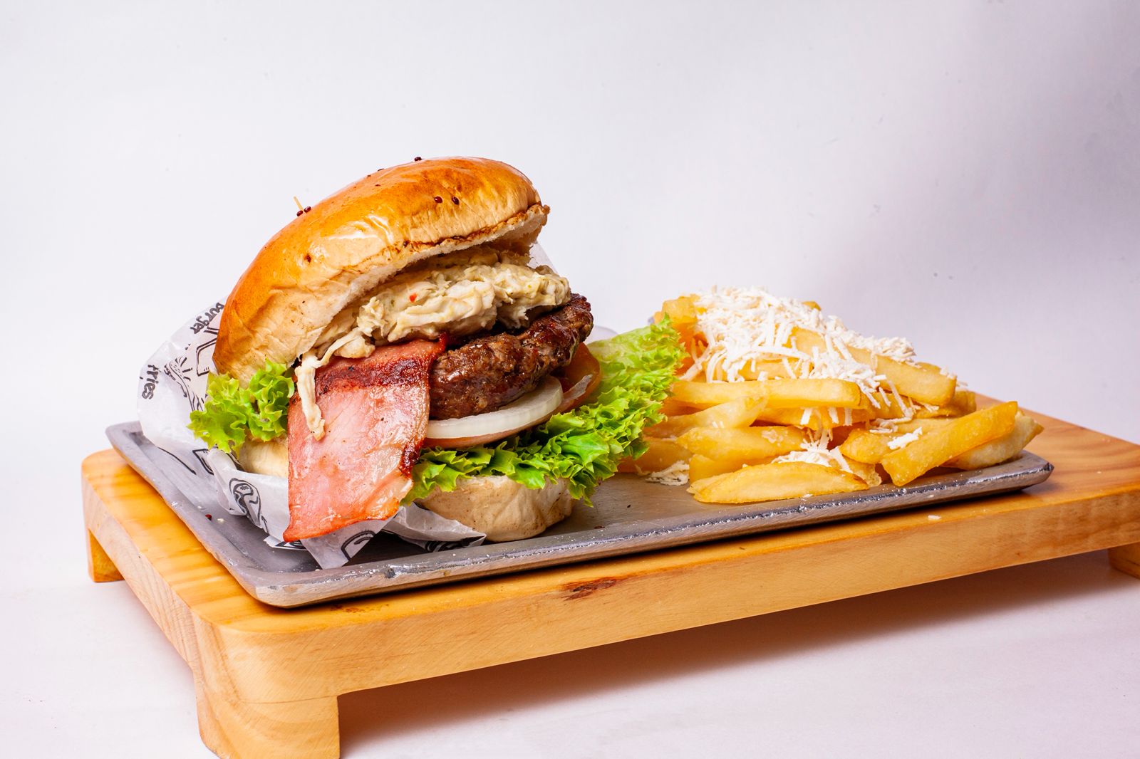 150 g de carne, mix de quesos, tocineta grill, vegetales frescos (lechuga), pan brioche, papas a la francesa y salsas (tártara y piña).