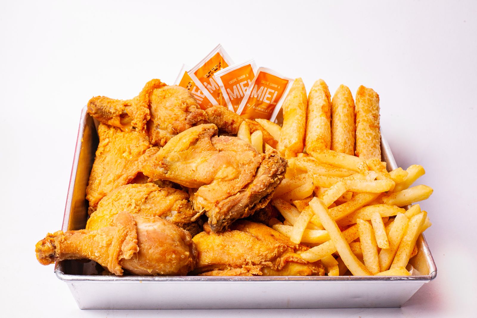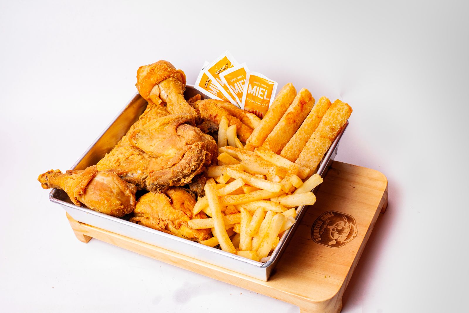 8 Piezas de pollo, 2 papas a la francesa y 4 yucas fritas.