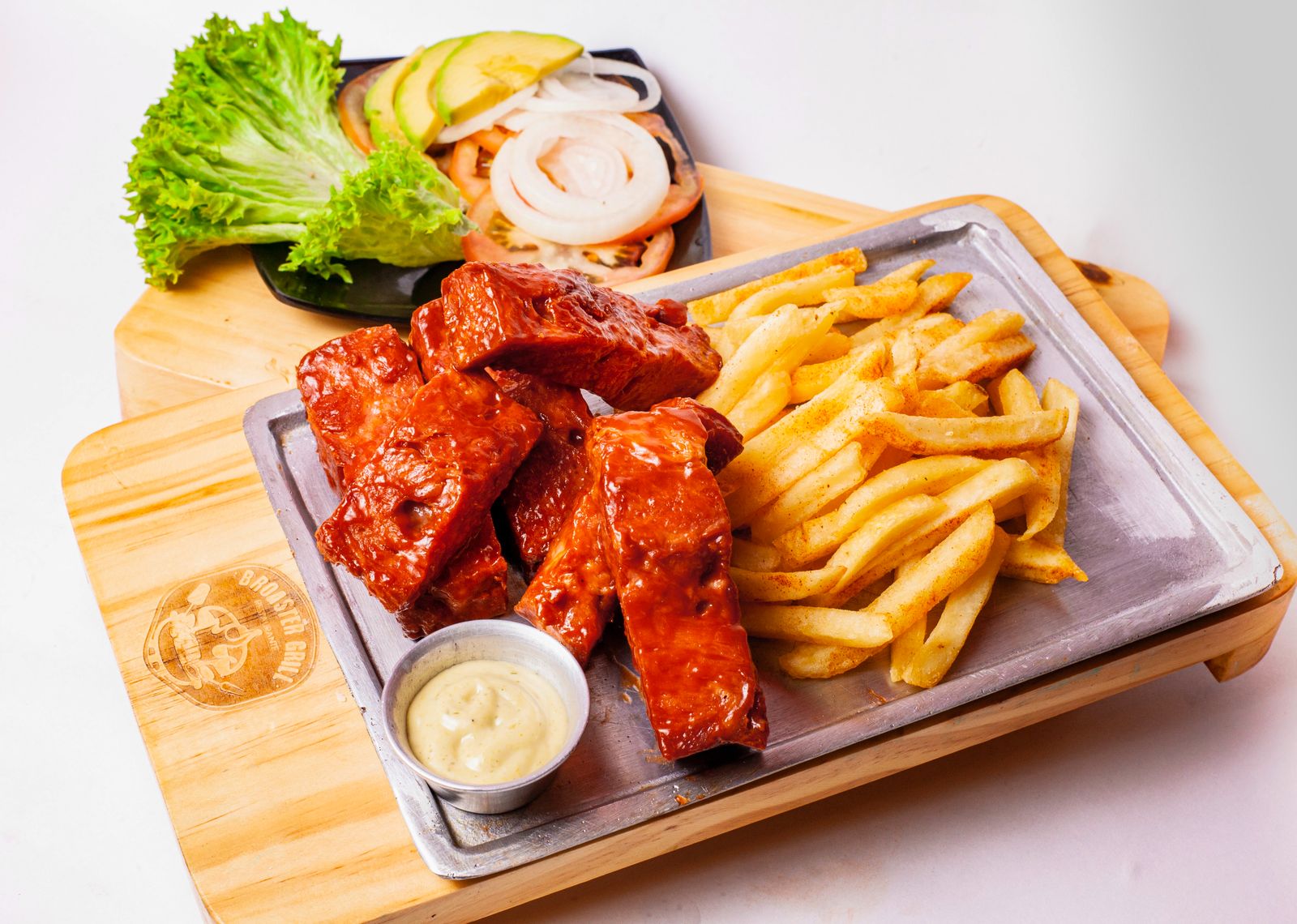 Costillas de cerdo bañadas en salsa BBQ de la casa, con papas a la francesa y ensalada fresca (tomate, cebolla y lechuga).