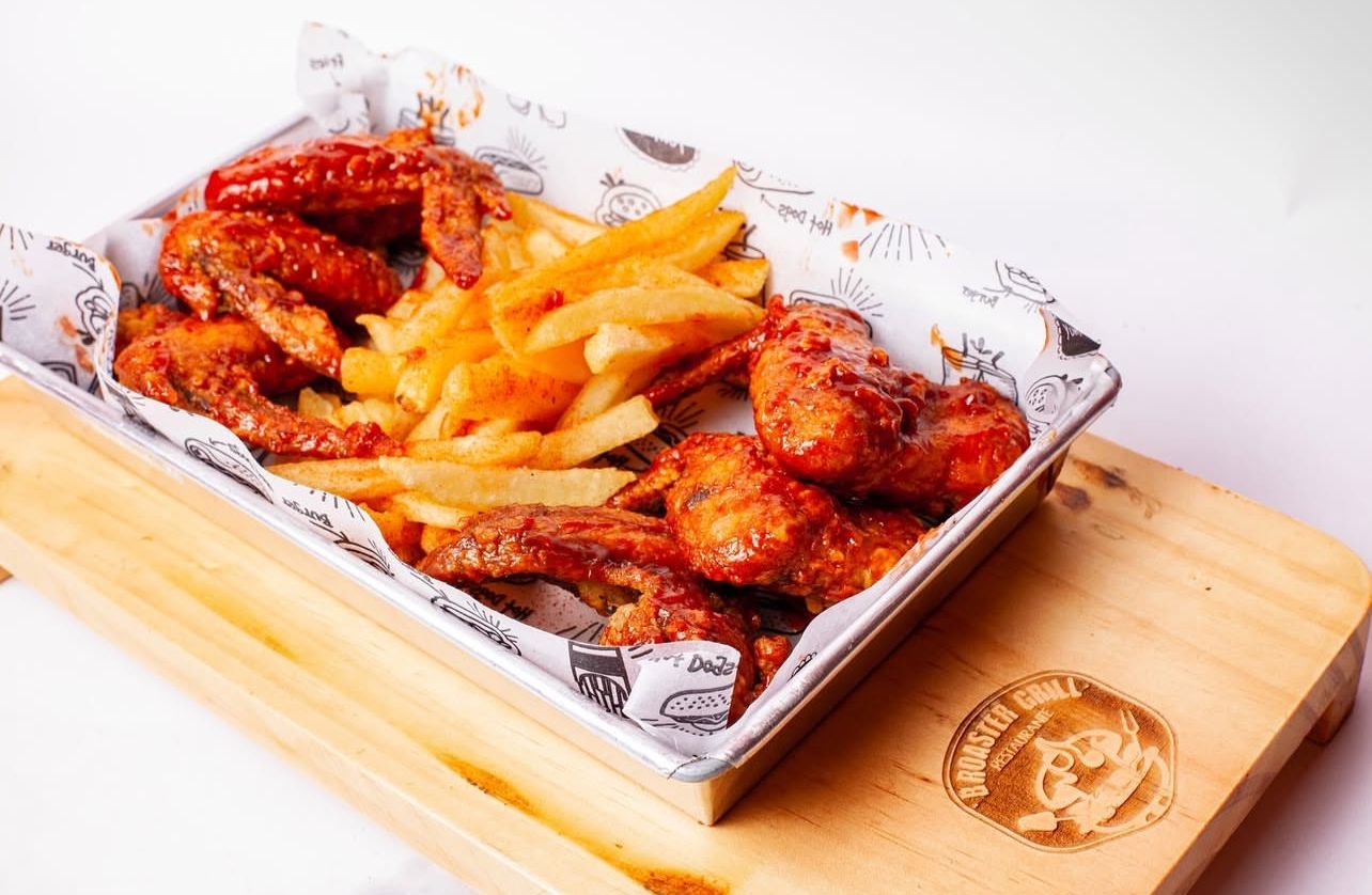 Pollo desmechado, 150 g de carne, mix de quesos, tocineta grill, vegetales frescos (lechuga), pan brioche, papas a la francesa y salsas (tártara y piña).