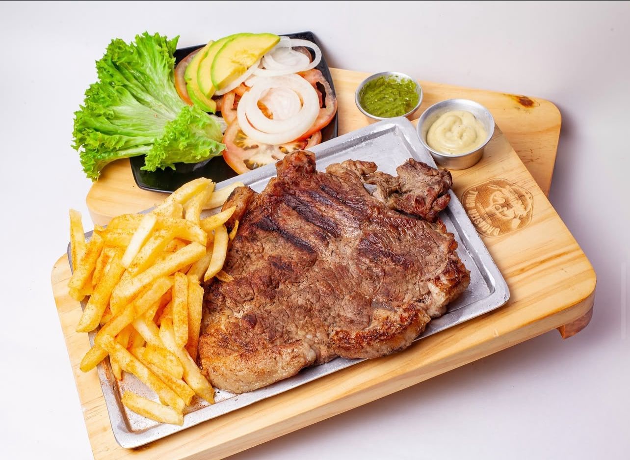 Corte jugoso de churrasco al grill acompañado de papas a la francesa y ensalada fresca (tomate, cebolla y lechuga).
