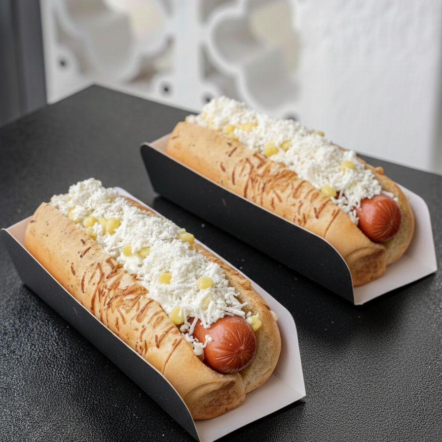 Pan perro artesanal, Salchicha americana, queso coteño, papa cabello de angel, maiz y salsa de la casa.