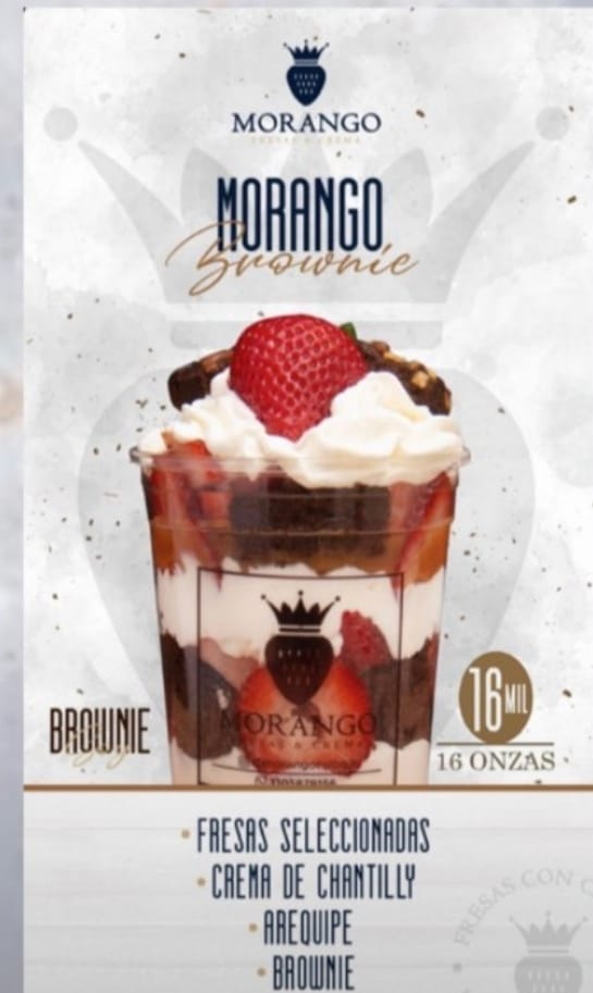 Fresas con chantilly, acompañadas de trozos de brownie y un sutil toque de arequipe.