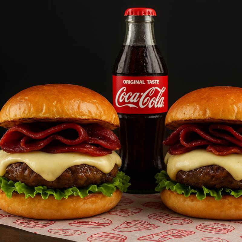 2 Hamburguesa Bacon + 1 Coca Cola 400: Pan artesanal, carne de res, 1ueso mozarella, tocineta, lechuga fresca, cebolla, tomate, salsas, SIN PAPAS a la francesa