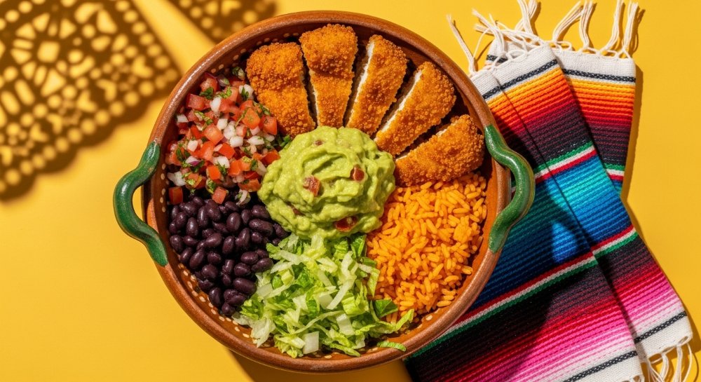 Bowl de pollo apanado, guacamole, pico de gallo, frijoles negros, arroz achiote y lechuga.