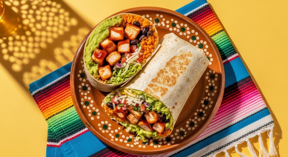 Burrito de pollo BBQ, guacamole, pico de gallo, frijoles negros, arroz achiote, lechuga y queso.