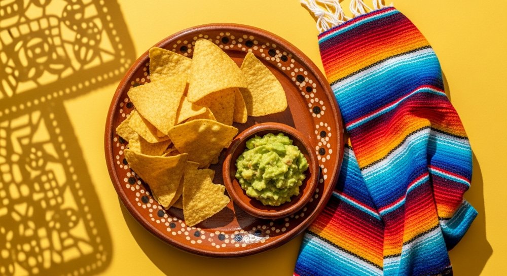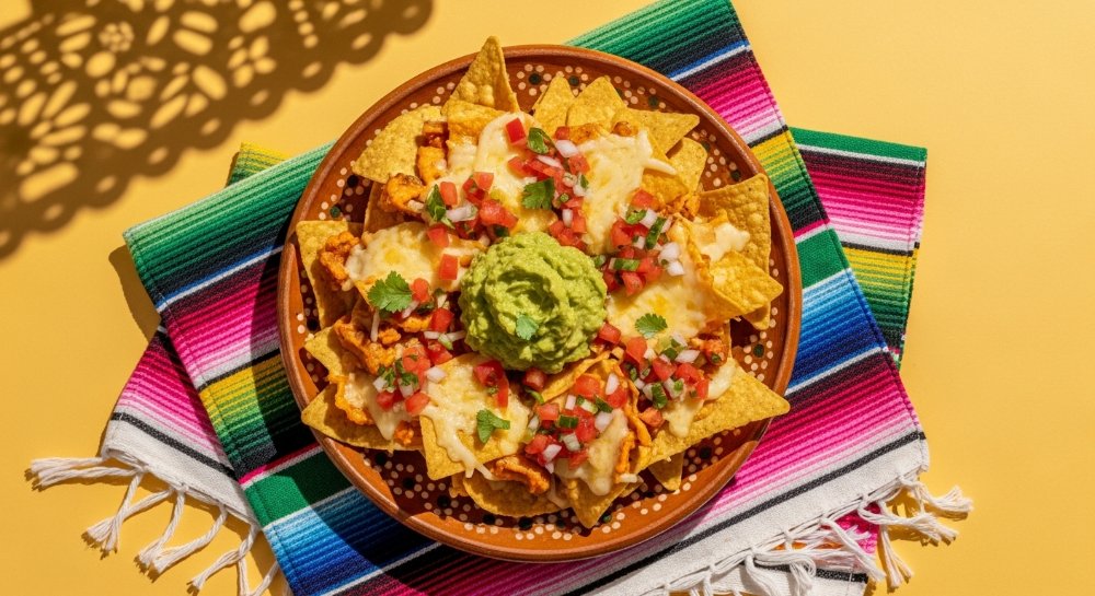 Nachos con totopos de maíz, proteína a elección, queso, guacamole y pico de gallo.