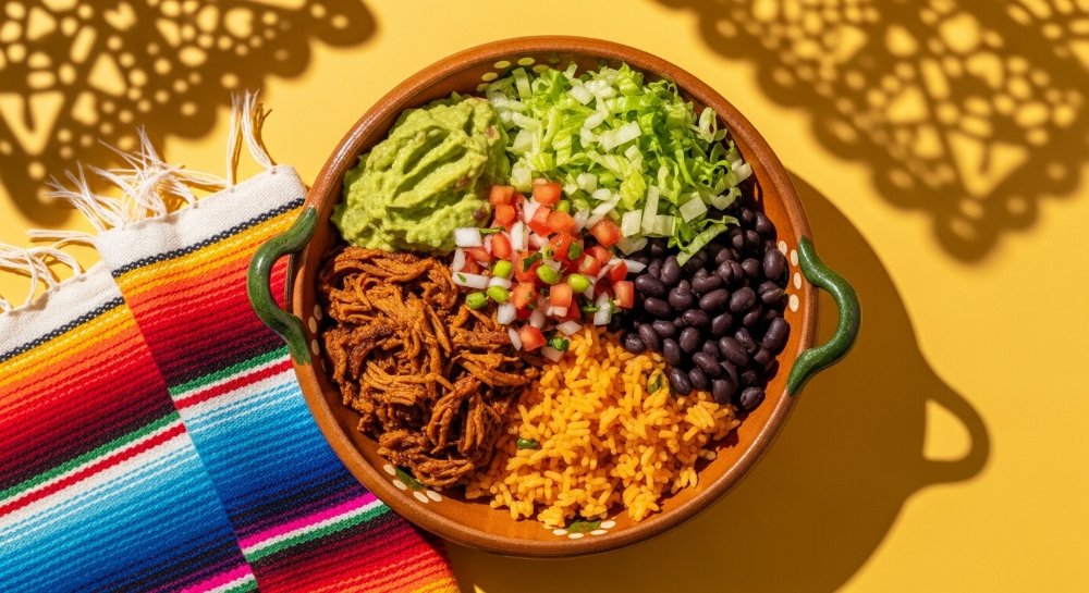 Burrito bowl de pulled pork, guacamole, pico de gallo, frijol negro, arroz achiote y lechuga.