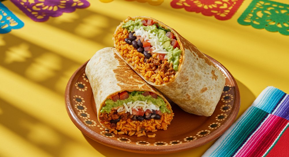 Burrito de carne chili, totopos triturados, guacamole, pico de gallo, frijoles negros, arroz achiote, queso y salsa de habanero (picante alto).