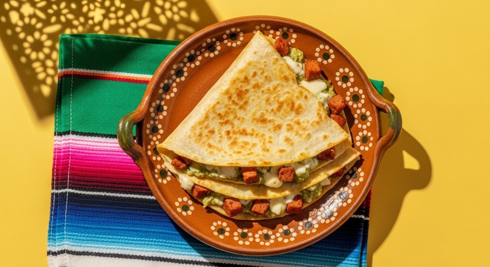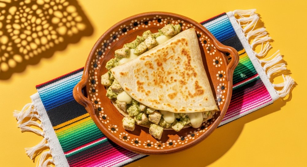 Quesadilla en tortilla de harina, queso doble crema y pollo en salsa verde.