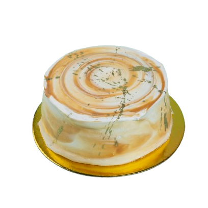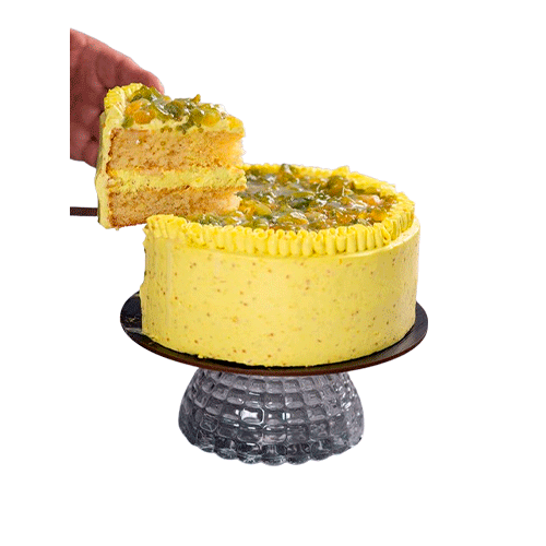 Bizcochuelo de limon, remojado en tres leches , rellena y cubierta en crema de maracuya