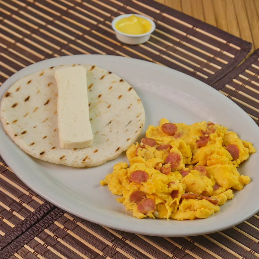 Dos unidades de huevo batidos en salchicha , acompañado de arepa rellena de queso