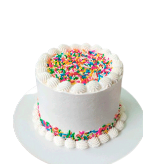 Bizcochuelo de vainilla rellena de arequipe , cubierta con crema blanca , grajeas de colores