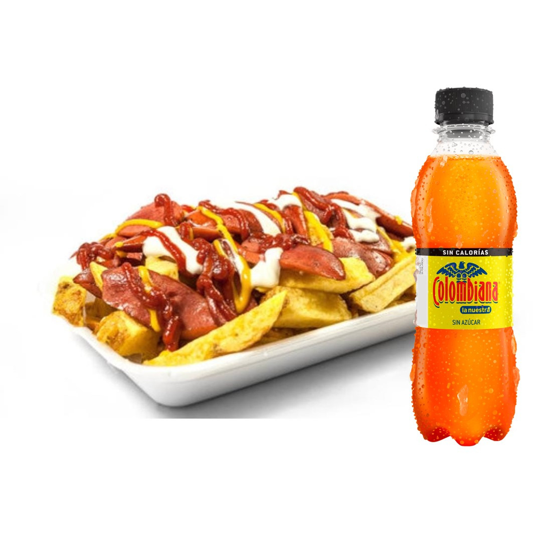 base de papa francesa , con salchicha americana ,queso y salsa de la casa