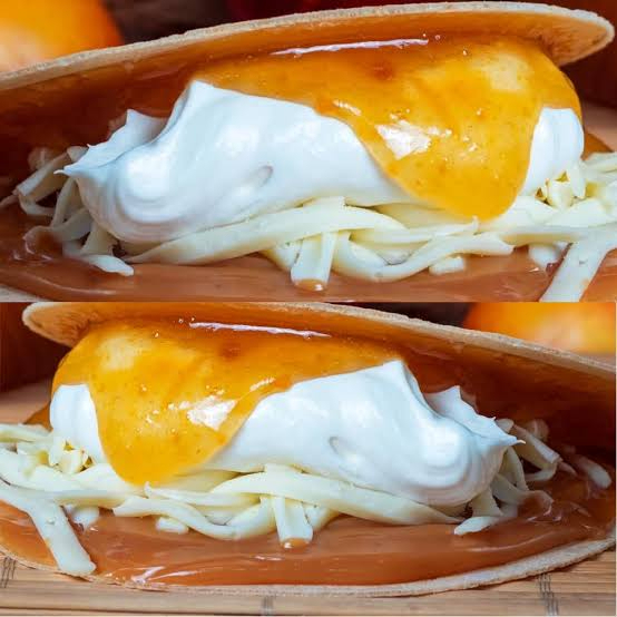 Galleta crocante , rellena de arequipe, Chantilly salsa de melocotón